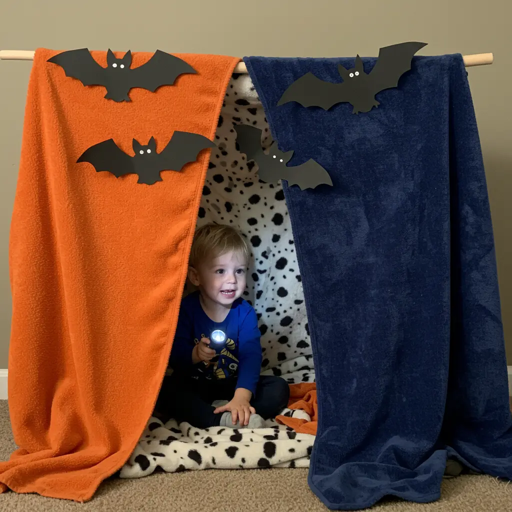 - Pro-Tip: Tape some black paper bat cutouts to the “ceiling” of the fort and give your toddler a flashlight to go “bat hunting.”