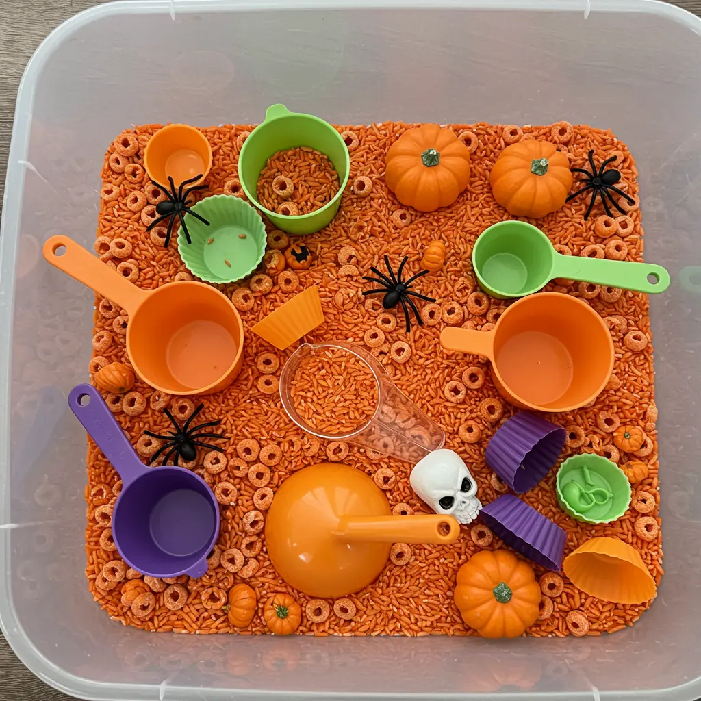 - The Idea: Fill a shallow plastic bin with a taste-safe base like black beans, dyed orange rice, or even Cheerios. Add in Halloween-themed items like plastic spiders, mini pumpkins, and silicone muffin cups for scooping.
