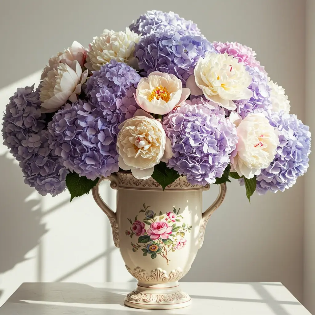 - Pro-Tip: Use flowers with large, voluminous heads like hydrangeas, peonies, and oriental lilies. Don’t be afraid to use tall, dramatic branches to add height and structure.