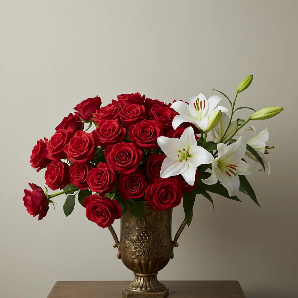 - Styling Cue: An all-white arrangement (roses, lilies, hydrangeas) in a simple glass vase is the epitome of timeless elegance.