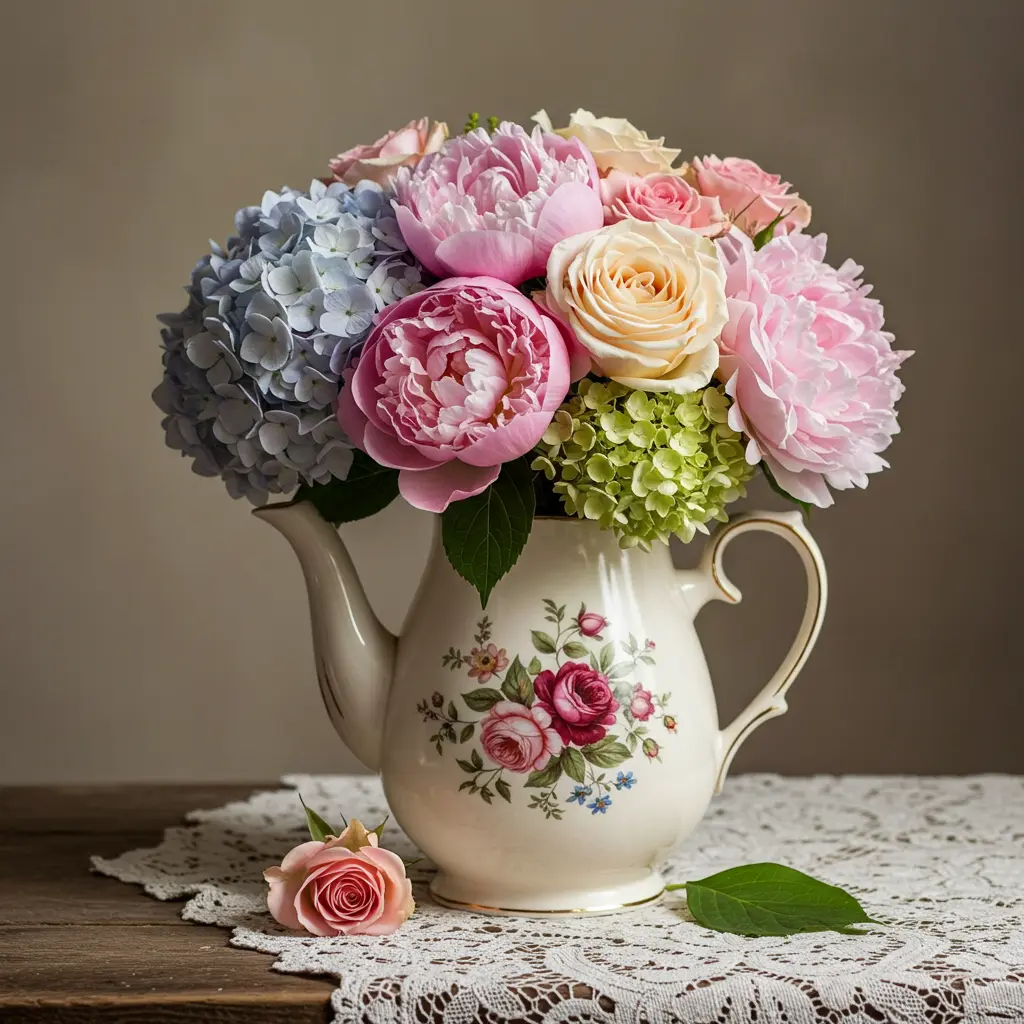 - Pro-Tip: Cut a small piece of wet floral foam to fit snugly inside the teapot. This will hold your tiny stems securely in place and keep them hydrated.