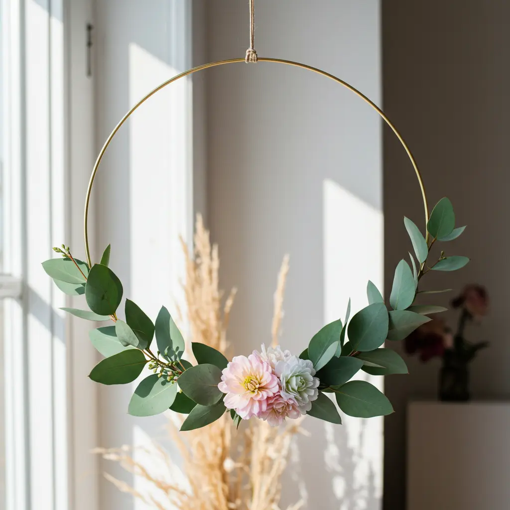 - Pro-Tip: For a more modern, asymmetrical look, use floral wire to attach your greenery and flowers to only one-third of the hoop (usually the bottom left or right), leaving the rest of the beautiful metal exposed.