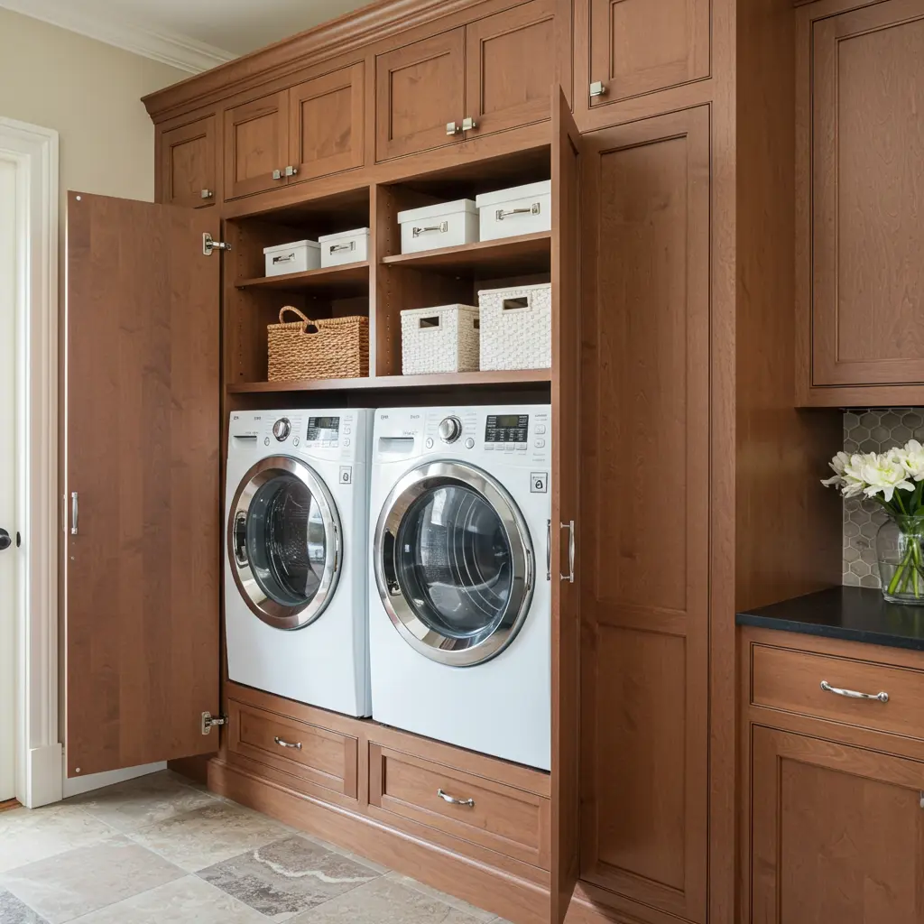 • Pro-Tip: Ask your cabinet maker to include a dedicated tall, narrow cabinet right beside the stack. This is the perfect hidden spot for an ironing board, broom, or stick vacuum.