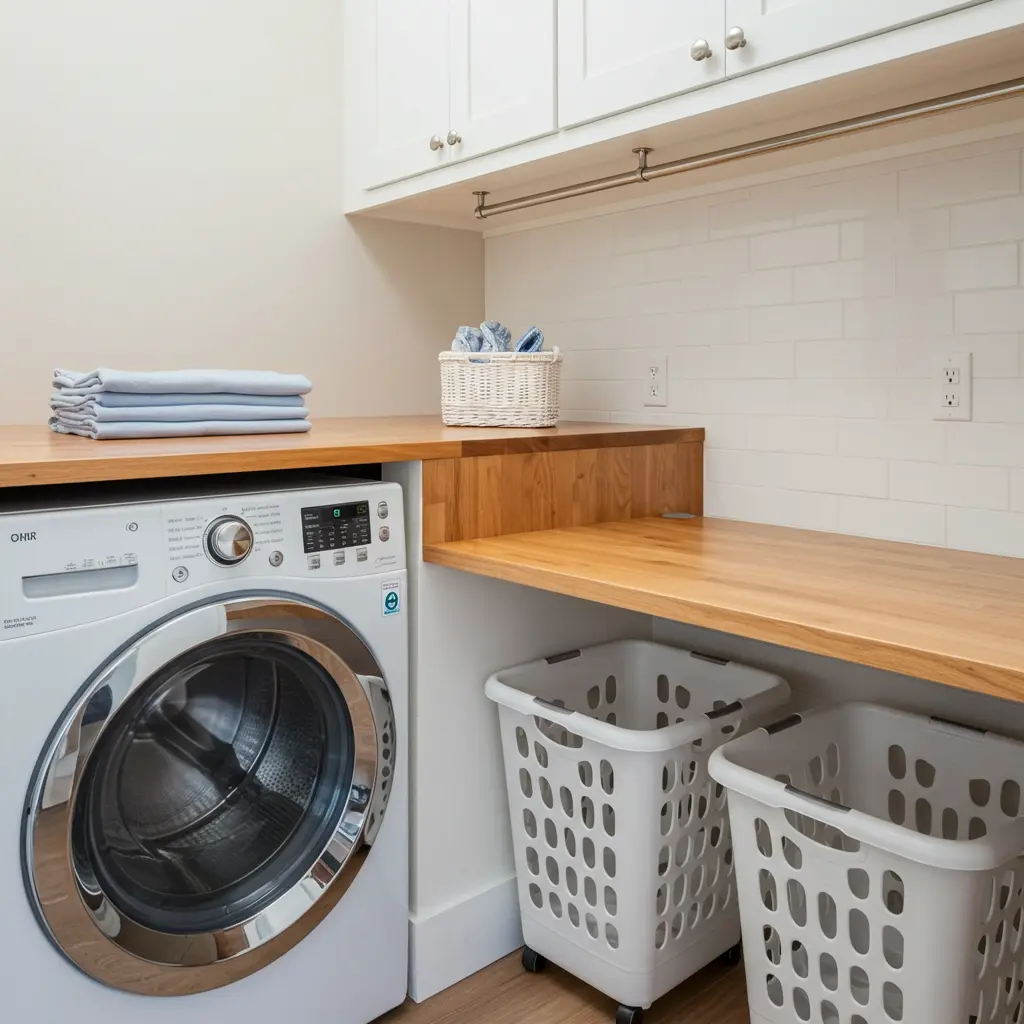 • Pro-Tip: Leave the space under the counter open. It’s the perfect parking spot for rolling laundry baskets, keeping the floor clear.