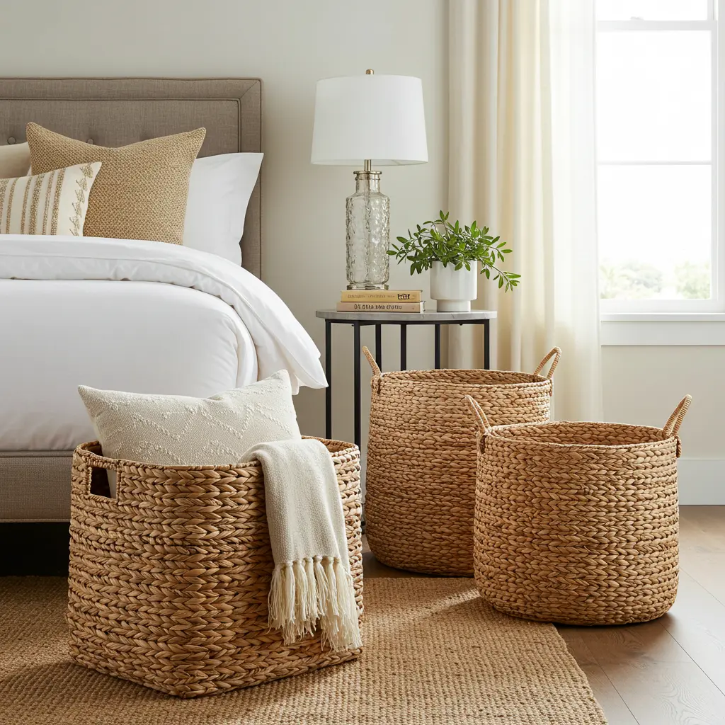 - Key Consideration: Choose baskets made from natural, textural materials like seagrass, water hyacinth, or rattan.