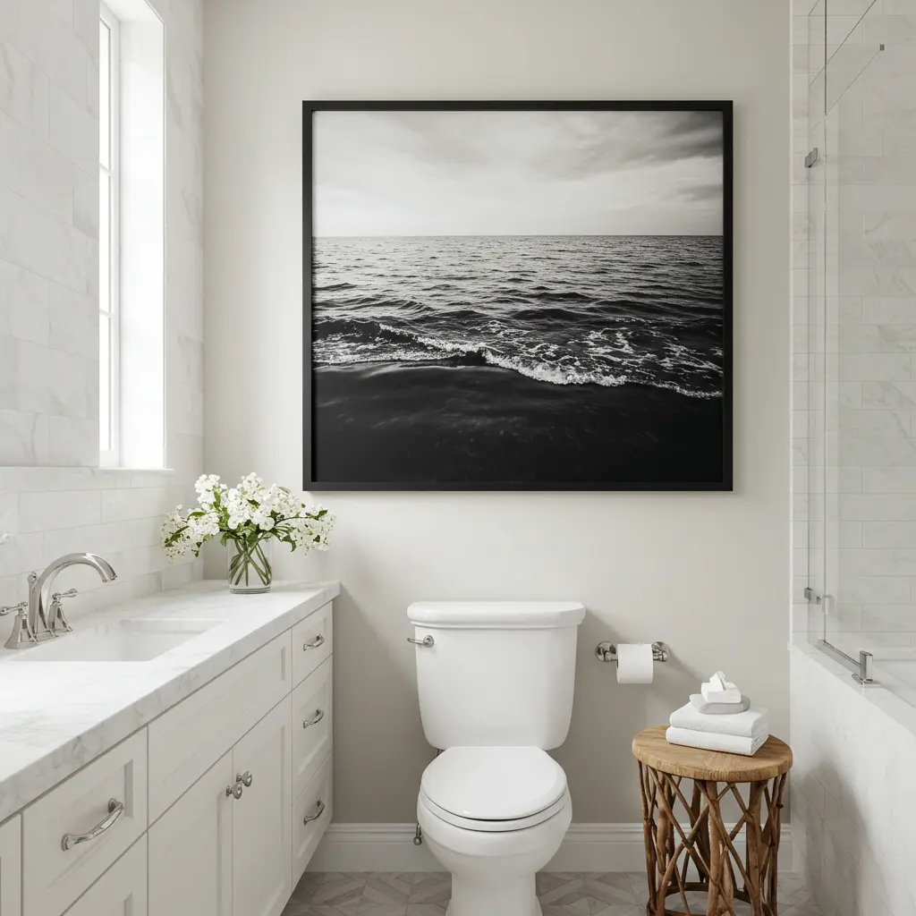 - Styling Cue: An oversized, abstract print or a dramatic black-and-white photograph hung above the toilet makes a huge statement.