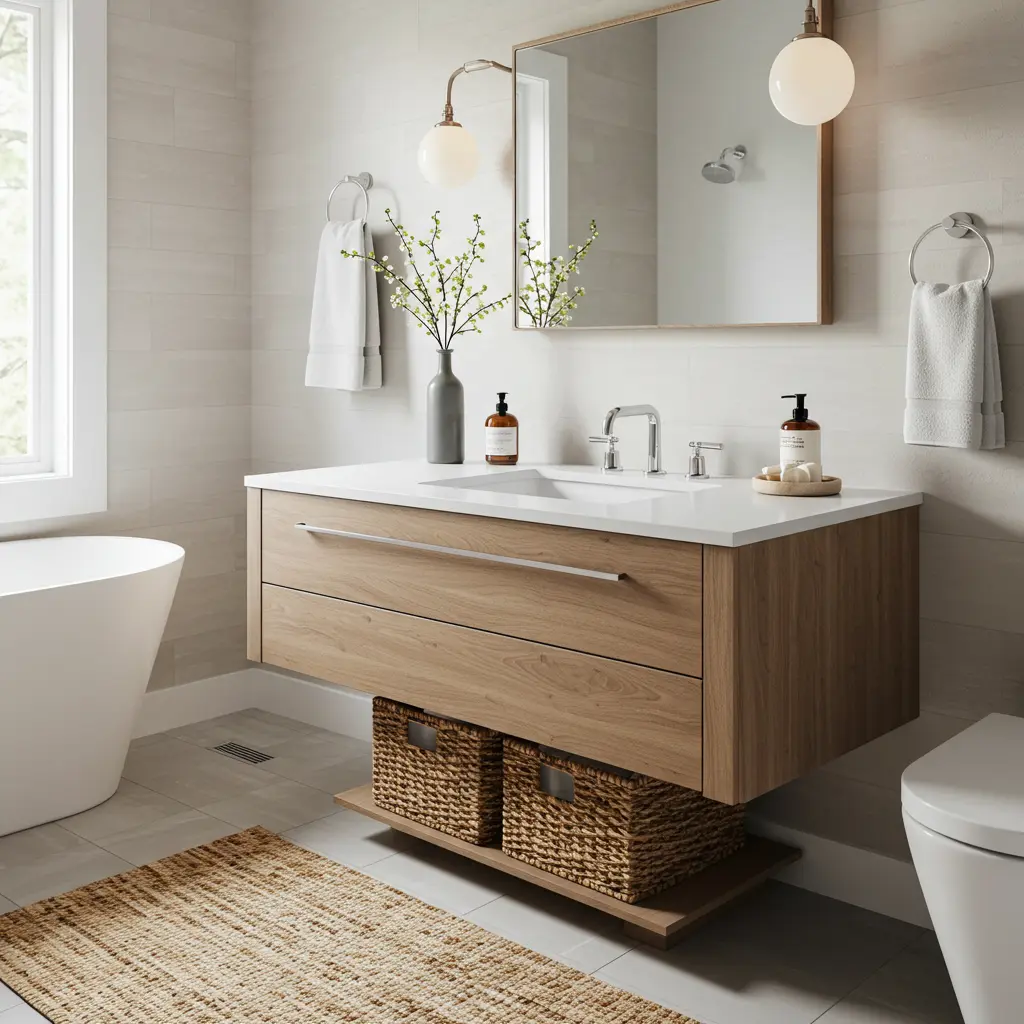 - Pro-Tip: Place a beautiful, textured basket underneath the vanity. It provides stylish, open storage for towels or toilet paper and adds a soft, organic element.