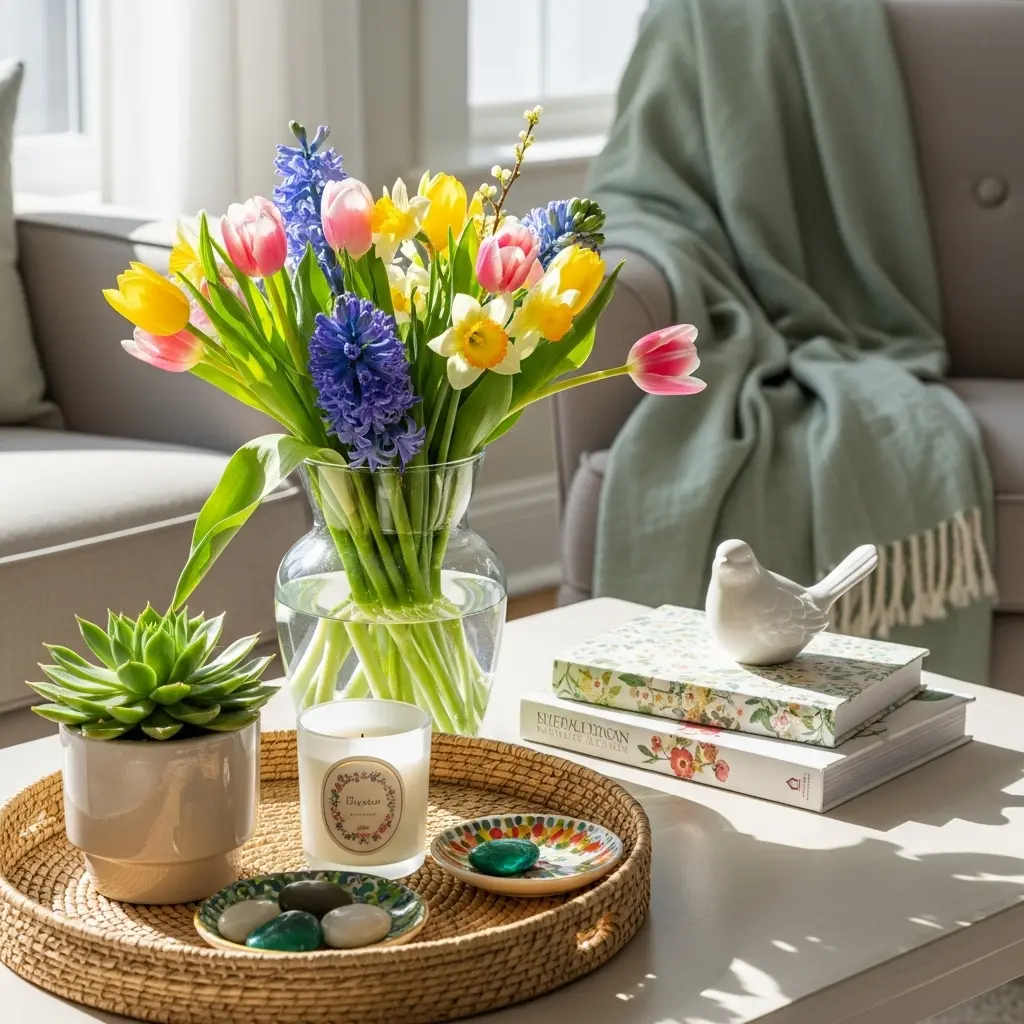 - Styling Cue: On a round tray, place a small plant or bud vase, a spring-scented candle, and a pretty ceramic bowl for a perfectly styled and contained vignette.