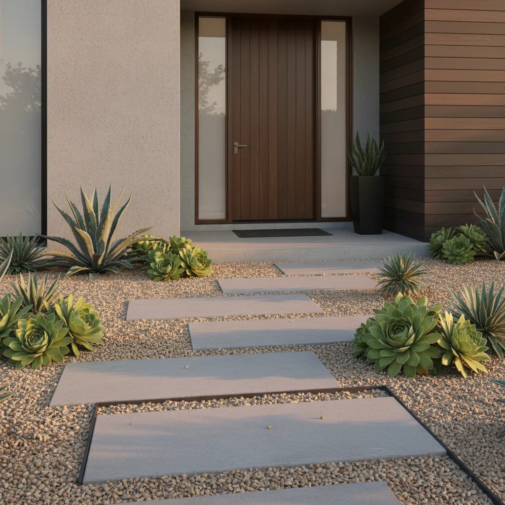 Small front yard landscaping with pea gravel, concrete pavers, and succulents.