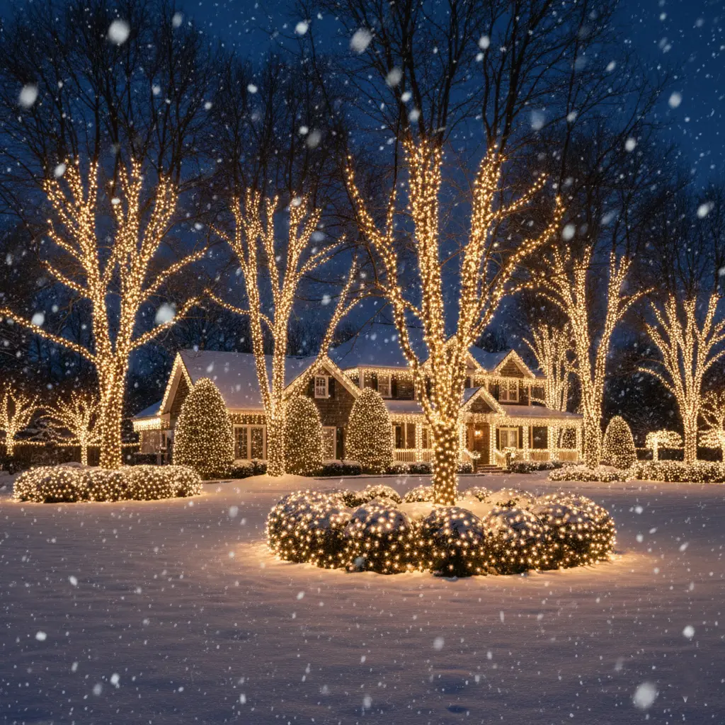 - Pro-Tip: Stick to classic warm white lights. Wrapping the trunks of trees, outlining shrubs, or lining the roofline provides a beautiful, ambient glow that feels festive but not overly “Christmas.”