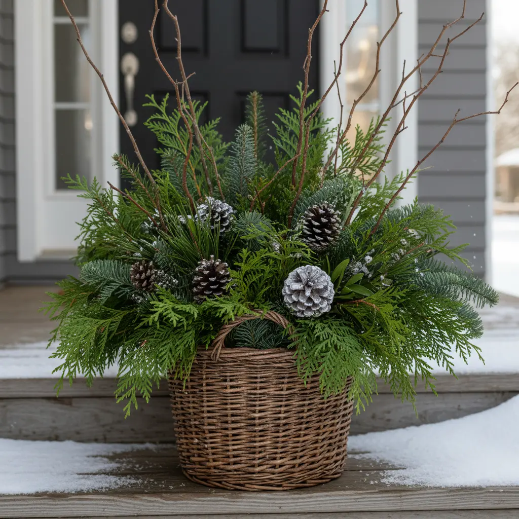 - Pro-Tip: Simply fill the basket to overflowing with a mix of foraged evergreen cuttings, pinecones, and bare branches.
