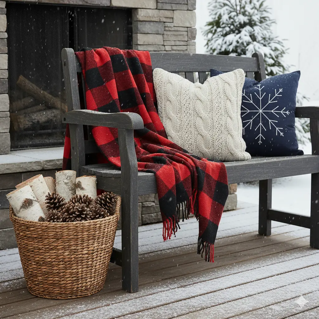 - Styling Cue: Place a stack of birch logs or a basket of pinecones next to the bench to complete the cozy, “winter lodge” feel.