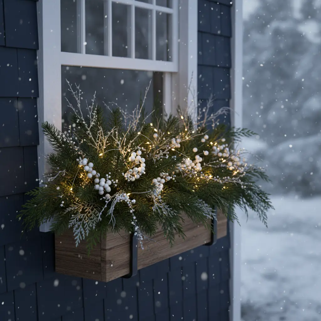 - Pro-Tip: Fill your window boxes with a base of faux evergreen branches, then add frosted faux branches, silver-painted twigs, and bunches of faux white berries.